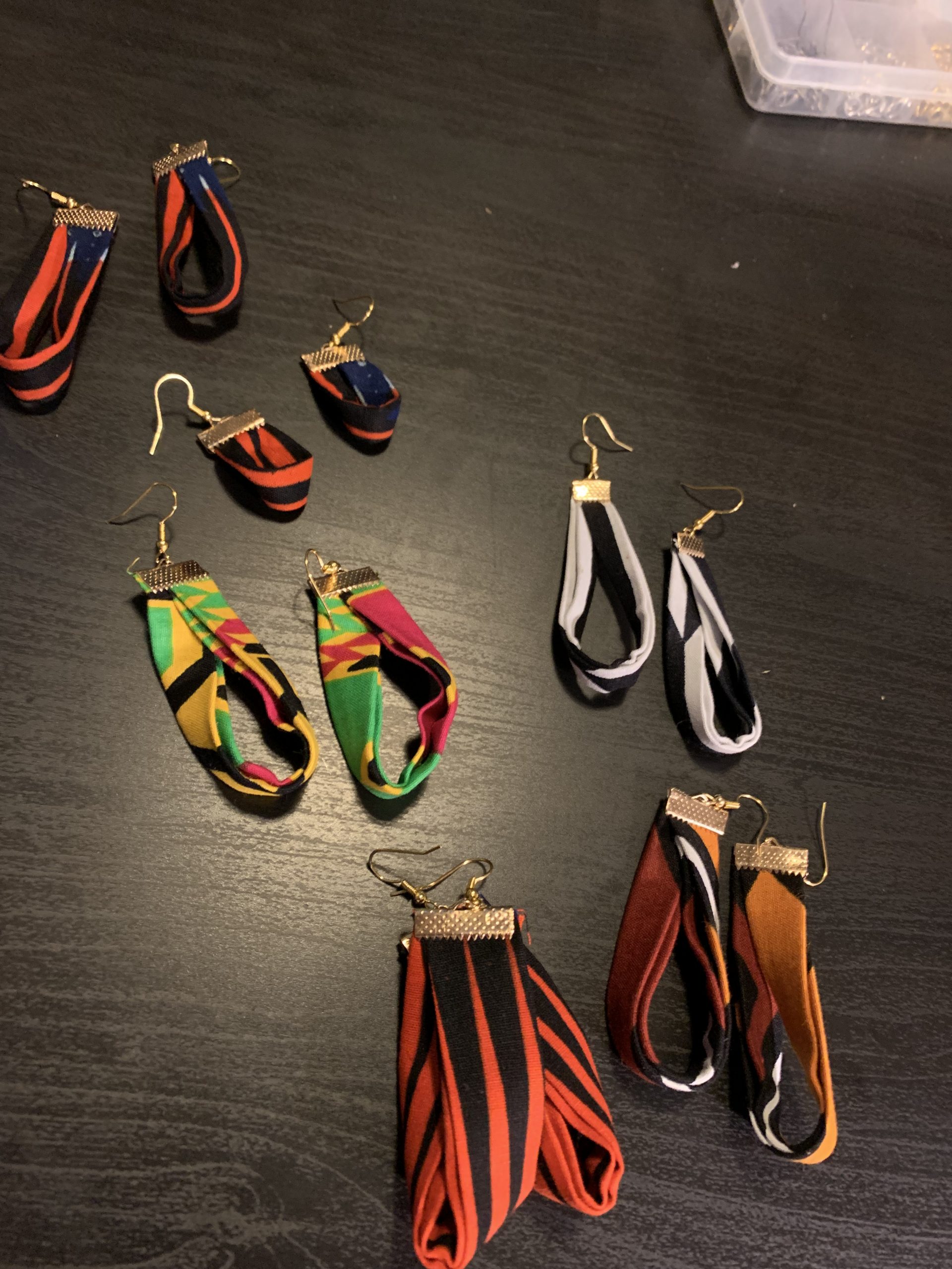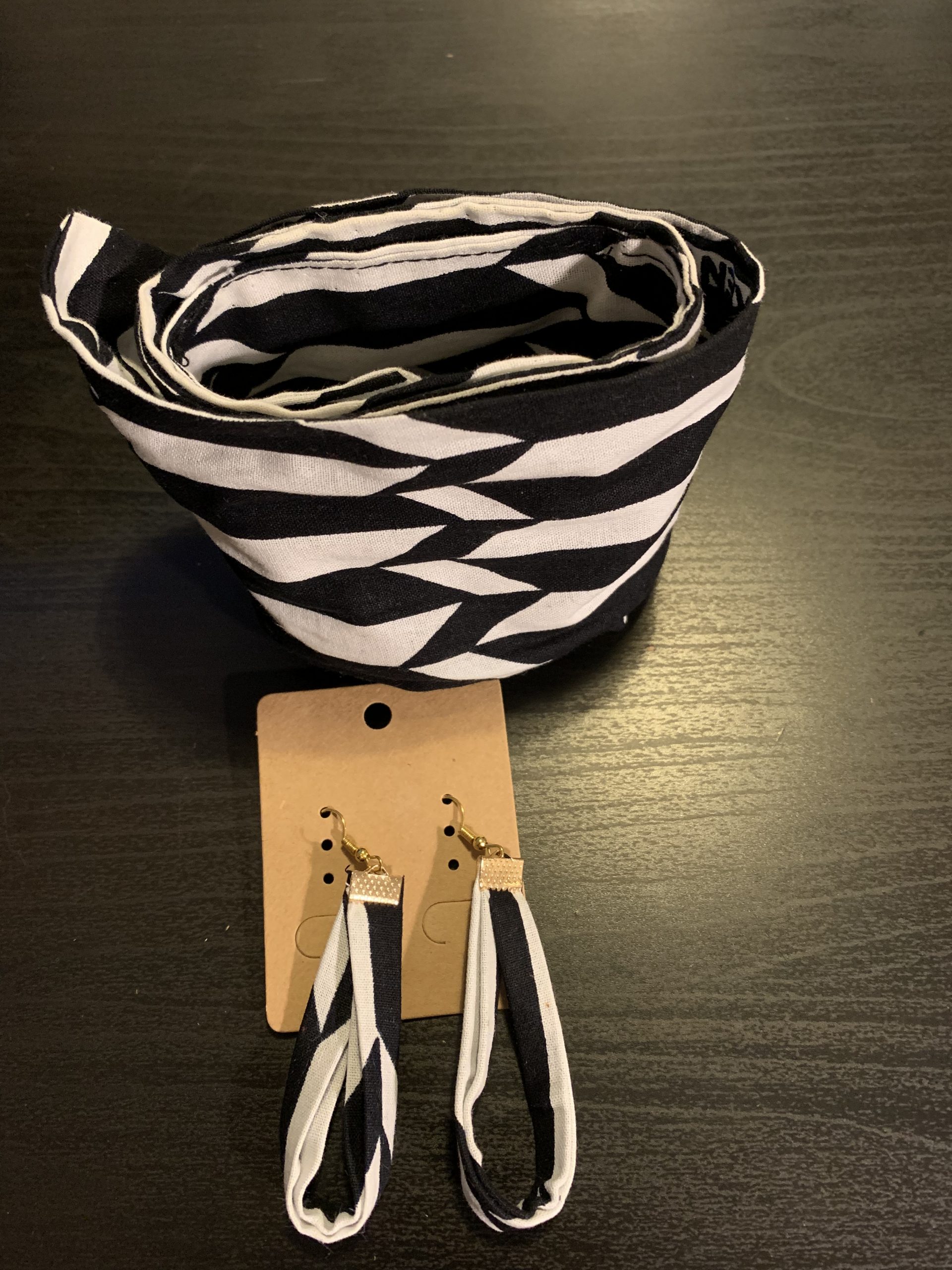 Boucles d’oreilles en tissu Wax blanc et noir.